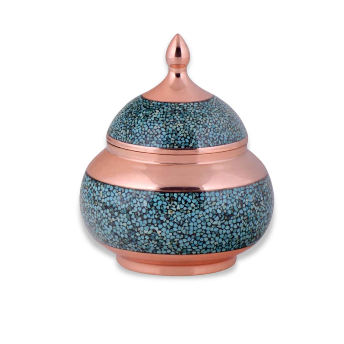قندان مسی سایز ۲۲ فیروزهکوبی دیار، ترکیبی دقیق از هنر کهن و متریال اصیل است. در فرآیند ساخت این اثر، بدنه مسی پس از چند مرحله پرداخت و صیقل آماده میشود تا دانههای فیروزه طبیعی با دقت روی آن نصب گردند. این چیدمان موزاییکی، انعکاسی چشمنواز ایجاد میکند که در نور محیط جلوهای خاص و متمایز به ظرف میبخشد.