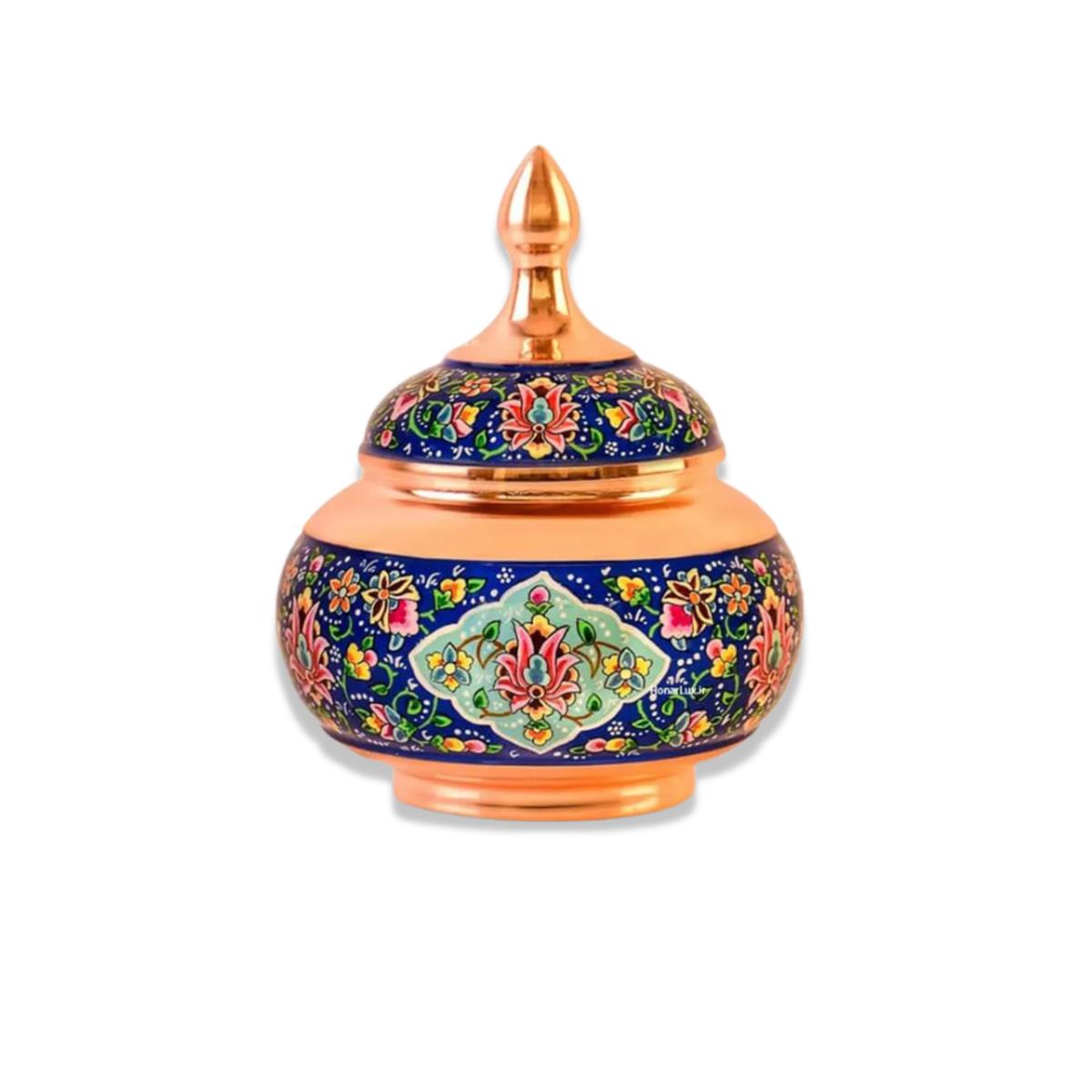 قندان پرداز سایز ۲۲ دیار، نمادی از هنر نقاشی روی مس ایرانی است. هنرمند با قلمموی ظریف و رنگهای اصیل، نقوش اسلیمی و گلوبوته را بهصورت لایهلایه روی بدنه مسی ایجاد کرده است. پوشش نهایی براق، جزئیات را برجسته کرده و جلوهای با عمق و شفافیت بالا به محصول میدهد.