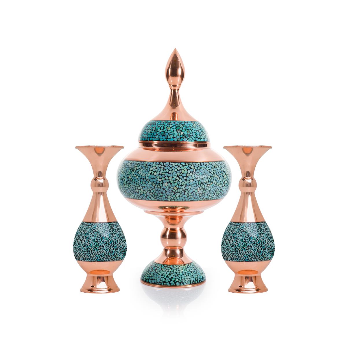 مجموعه ی ۳ تکه , ترکیبی از ۲ گلدان فیروزه با ارتفاع ۱۶ سانتیمتر و یک قندان با ارتفاع 18 سانتیمتر