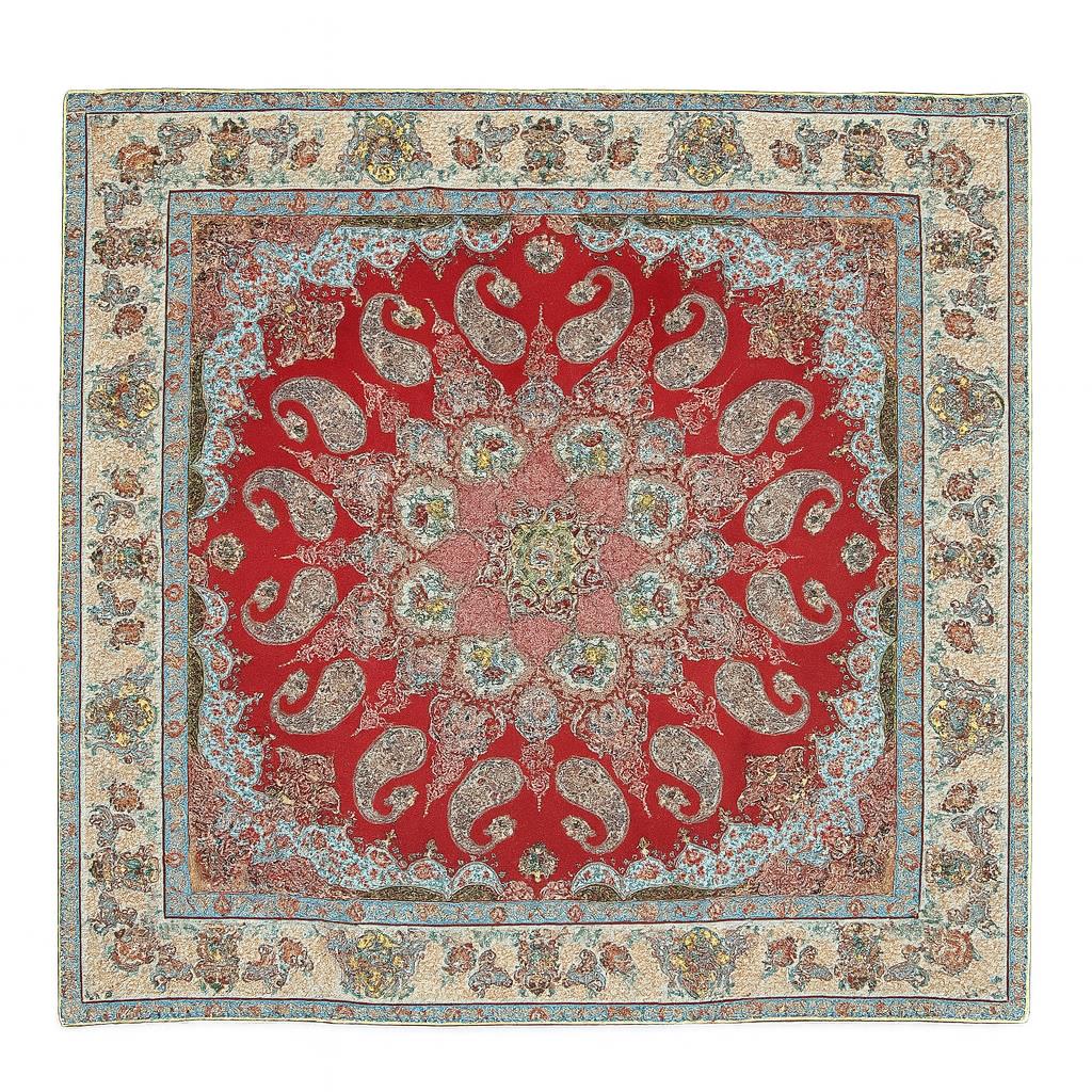ترمه طرح باغ بهشت , زمینه ی سرخ , ابعاد یک متر در یک متر