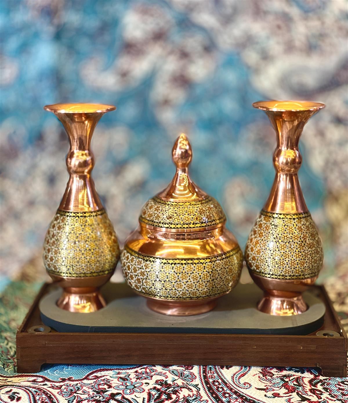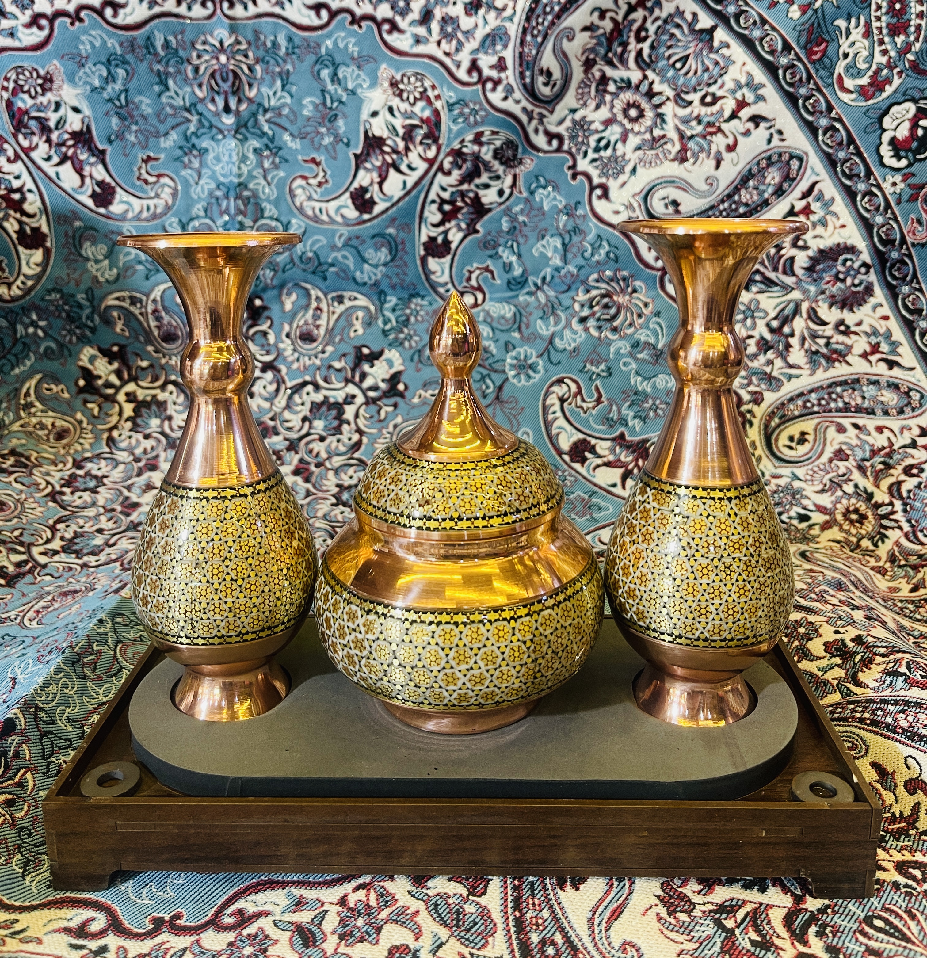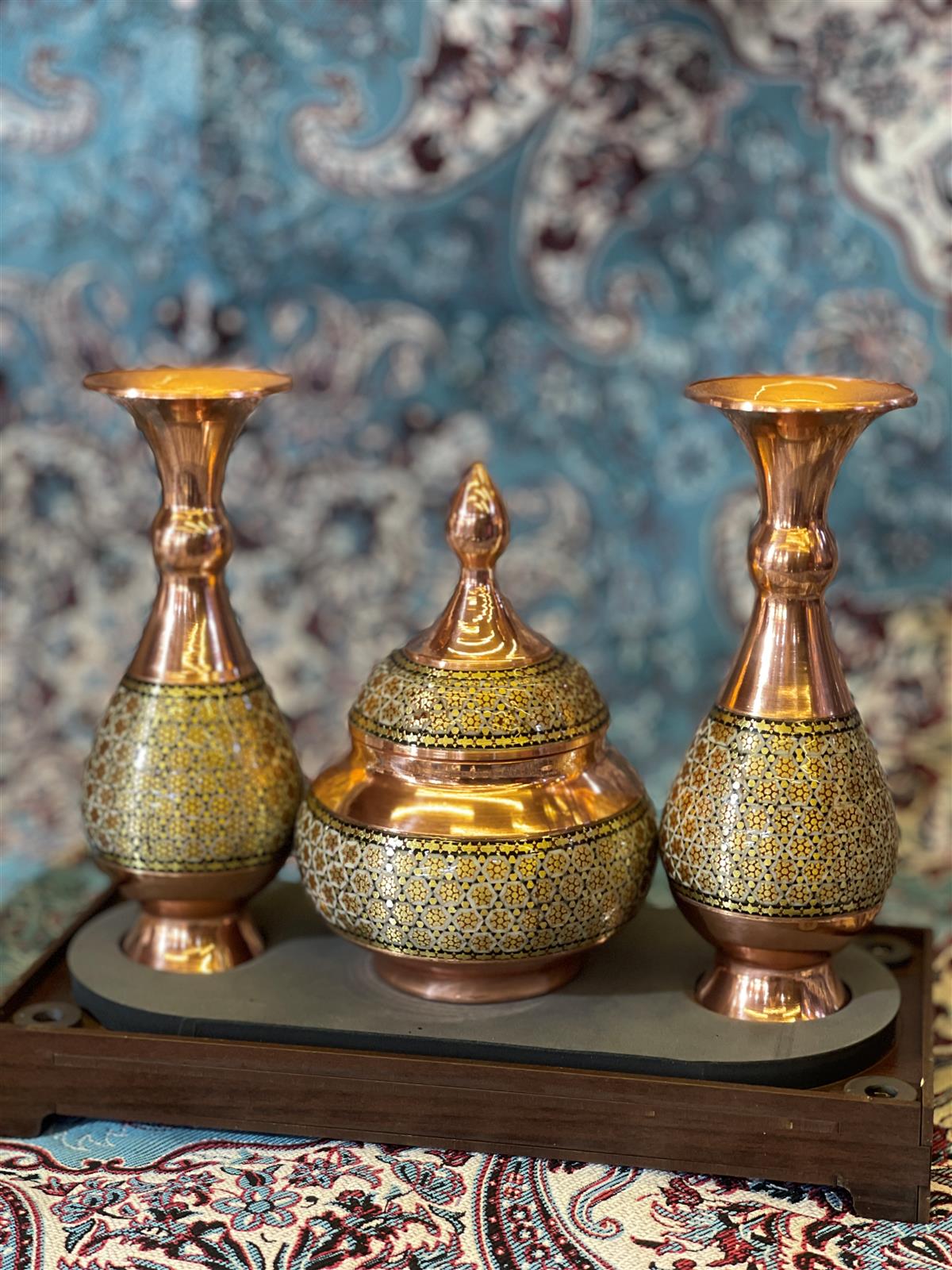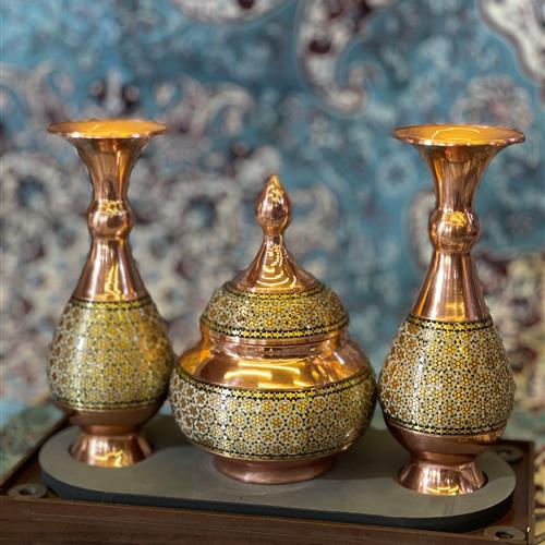 مجموعه ی ۳ تکه , ترکیبی از ۲ گلدان خاتم با ارتفاع ۱۶ سانتیمتر و یک قندان خاتم با ارتفاع 13 سانتیمتر